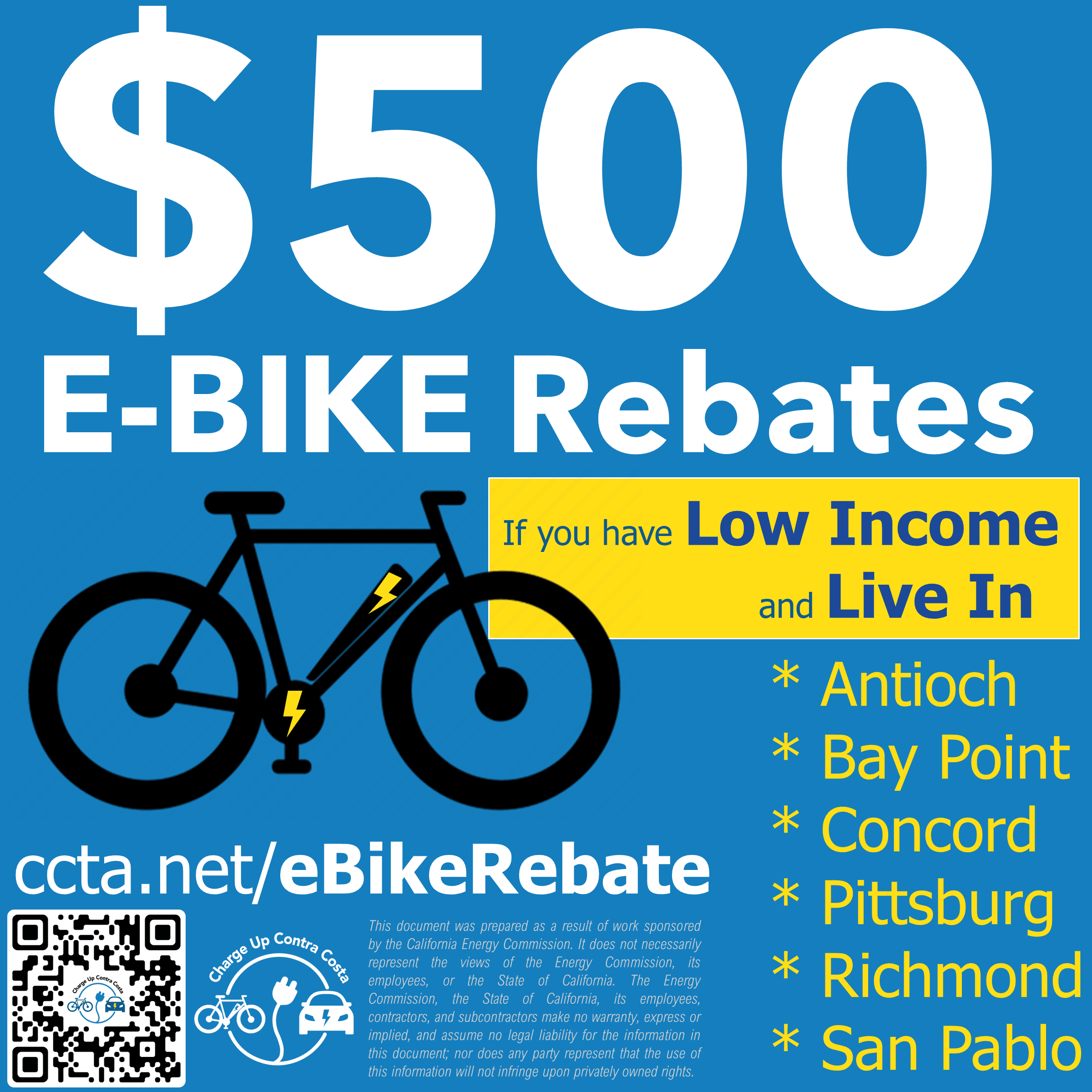 - Can’t afford an e-bike? Think again! $500 cash rebates are available for people with low incomes in Contra Costa. Learn more and apply for your rebate at Charge Up Contra Costa.